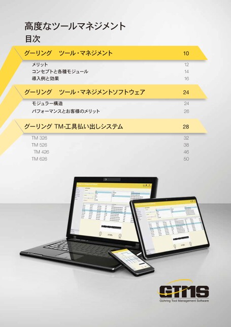 高度なツールマネジメント目次グーリングツール・マネジメントメリットコンセプトと各種モジュール導入例と効果グーリングツール・マネジメントソフトウェアモジュラー構造パフォーマンスとお客様のメリットグーリングTM-工具払い出しシステムTM326TM526TM426TM626101214162424262832384650GühringToolManagementSoftware