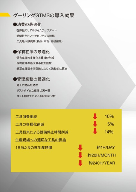 ➡➡➡工具消費削減10%工具の多様化削減5%工具紛失による設備停止時間削減14%生産現場への適切な工具の供給グーリングGTMSの導入効果●消費の最適化在庫数のリアルタイムアップデート透明性とトレーサビリティの確保工具最大限使用(新品・中古・再研削品)●保有在庫の最適化保有在庫の多様化と重複の削減保有在庫の最大最小数を設定適正在庫数を消費数に応じて流動的に算出●管理業務の最適化適正に物品を発注リアルタイムな在庫状況一覧コスト割当てによる系統別の分析➡➡➡1日当たりの非生産時間約1H/DAY約20H/MONTH約240H/YEAR