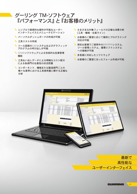グーリングTM-ソフトウェア『パフォーマンス』と『お客様のメリット』シンプルで直感的な操作が可能なユーザーインターフェイスとメニューナビゲーションさまざまな対象フィールドの正確な消費分析(工具・機械・生産ライン)パーソナルダッシュボードの作成が可能お客様のご要望に応じて個別にプログラミング工具リストの作成ツール図面のCADシステムおよびグラフィックプログラムの呼び出しが可能GTMSソフトウェアによる包括的な在庫管理機能工具払い出しデータによる明確なコスト配分による各部門の生産性の状況把握コンポーネント、機械または製造部門ごとの様々な基準における工具使用量に関する正確な分析対応が可能現在お客様でご使用中のERP/PPSシステム、ツール管理システム、循環リフトシステムへの接続が可能多言語に対応したソフトウェアお客様のご要望に沿ったフォーム作成が可能最新で高性能なユーザーインターフェイス26