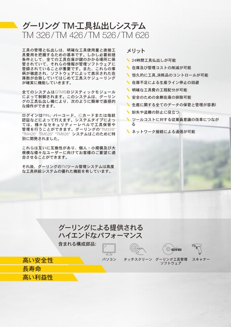 グーリングTM-工具払出しシステムTM326/TM426/TM526/TM626メリット24時間工具払出しが可能在庫及び管理コストの削減が可能恒久的に工具,消耗品のコントロールが可能在庫不足による生産ライン停止の回避明確な工具費の工程配分が可能安全のための余剰在庫の排除可能生産に関する全てのデータの保管と管理が容易l紛失や盗難の防止に役立つツールコストに対する従業員意識の改革につながるネットワーク接続による通信が可能工具の管理と払出しは、明確な工具使用量と直接工具費用を把握するための基本です。しかし必要前提条件として、全ての工具在庫が鍵のかかる場所に保管されていて、それらの情報が管理ソフトウェアに登録されていることが重要です。また、これらの事柄が徹底され、ソフトウェアによって表示された在庫数が合致していてはじめて工具スケジューリングが確実に機能していきます。全てのシステムはGTMSロジスティックモジュールによって制御されます。このシステムは、グーリングの工具払出し機により、次のように簡単で直感的な操作ができます。ログインはPIN、バーコード、ICカードまたは指紋認証などによって行えます。システムタイプによっては、様々なセキュリティーレベルで工具保管や管理を行うことができます。グーリングの“TM326““TM626“システムはこのために特“TM426“別に開発されました。“TM526“これらは互いに互換性があり、個人・小規模及び大規模な様々なユーザーに向けてお客様のご要望に適合させることができます。それ故、グーリングのTMツール管理システムは高度な工具供給システムの優れた機能を有しています。グーリングによる提供されるハイエンドなパフォーマンス含まれる構成部品:高い安全性長寿命高い利益性パソコンタッチスクリーングーリング工具管理ソフトウェアスキャナー