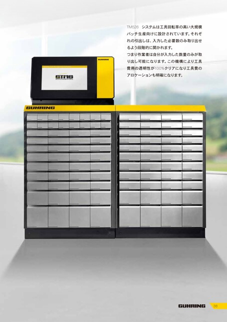 TM526システムは工具回転率の高い大規模バッチ生産向けに設計されています。それぞれの引出しは、入力した必要数のみ取り出せるよう段階的に開かれます。つまり作業者は自分が入力した数量のみが取り出し可能になります。この機構により工具費用の透明性が100%クリアになり工具費のアロケーションも明確になります。38
