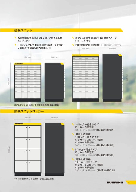 1500mm40„電源供給“仕様8ロッカー付きタイプロッカーごとに230V電源ロッカー内部寸法:330x331x384mm(幅x高さx奥行き)LEDディスプレ搭載の手動式フルオープン引出しを採用(各引出し最大荷重20kg)2種類の高さが選択可能:1300mmI1500mm885mm650mm885mm650mm16ロッカー付きタイプロッカー内部寸法:330x151x534mm(幅x高さx奥行き)„電源供給“仕様16ロッカー付きタイプロッカーごとに230V電源ロッカー内部寸法:330x151x384mm(幅x高さx奥行き)8ロッカー付きタイプロッカー内部寸法:330x340x534mm(幅x高さx奥行き)エクステンションユニット(2種類の高さ)正面と側面拡張ユニットロッカー885mm650mm1300mm1680mmTM526拡張ユニット区画ロック式正面と側面拡張ユニットRUNGSEINHEITERWEITERUNGSEINHEITERWEITERUNGSEINHEIT高剛性鋼板構造による電子ロック付き工具払出しシステムオプションにて個別の引出し高さやパーテーションにも対応