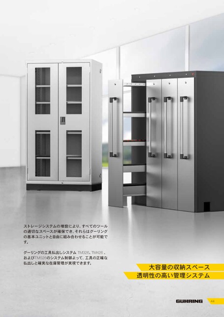 ストレージシステムの増設により、すべてのツールの適切なスペースが確保でき、それらはグーリングの基本ユニットと自由に組み合わせることが可能です。グーリングの工具払出しシステムTM326、TM426、およびTM526のシステム制御よって、工具の正確な払出しと確実な在庫管理が実現できます。大容量の収納スペース透明性の高い管理システム44
