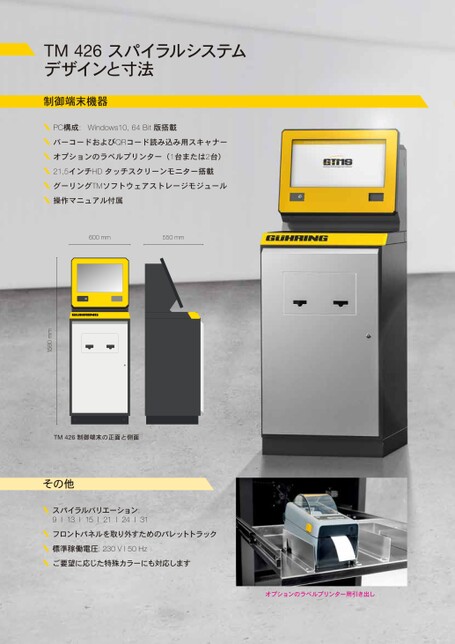 オプションのラベルプリンター用引き出しTM426スパイラルシステムデザインと寸法制御端末機器PC構成:Windows10,64Bit版搭載バーコードおよびQRコード読み込み用スキャナーオプションのラベルプリンター(1台または2台)21,5インチHDタッチスクリーンモニター搭載グーリングTMソフトウェアストレージモジュール操作マニュアル付属600mm550mmTM426制御端末の正面と側面その他スパイラルバリエーション:9I13I15I21I24I31フロントパネルを取り外すためのパレットトラック標準稼働電圧:230VI50Hzご要望に応じた特殊カラーにも対応します1580mm