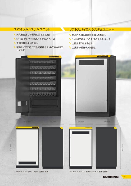 スパイラルシステムユニットリフトスパイラルシステムユニット先入れ先出しの原則に沿った払出し6〜7段で各々10のスパイラルスペース下部出庫口より取出し製品サイズに応じて設定可能なスパイラルバリエーション先入れ先出しの原則に沿った払出し6〜8段で各々10のスパイラルスペース上部出庫口より取出し工具用の搬送リフト搭載940mm880mm940mm880mm1645mm46TM426スパイラルシステム正面と側面TM426リフトスパイラルシステム正面と側面1645mm