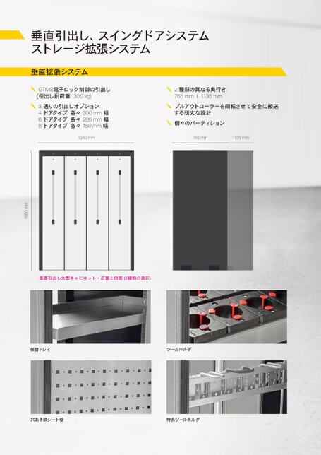 VERTIKALAUSZUGSCHRANK3通りの引出しオプション:VERTIKALAUSZUGCHRK4ドアタイプ各々300mm幅6ドアタイプ各々200mm幅8ドアタイプ各々150mm幅プルアウトローラーを回転させて安全に搬送する頑丈な設計個々のパーティション1340mm765mm1135mm1680mm垂直引出し、スイングドアシステムストレージ拡張システム垂直拡張システムGTMS電子ロック制御の引出し(引出し耐荷重:300kg)2種類の異なる奥行き:765mmI1135mm垂直引出し大型キャビネット・正面と側面(2種類の奥行)保管トレイツールホルダ穴あき鉄シート壁特長ツールホルダ